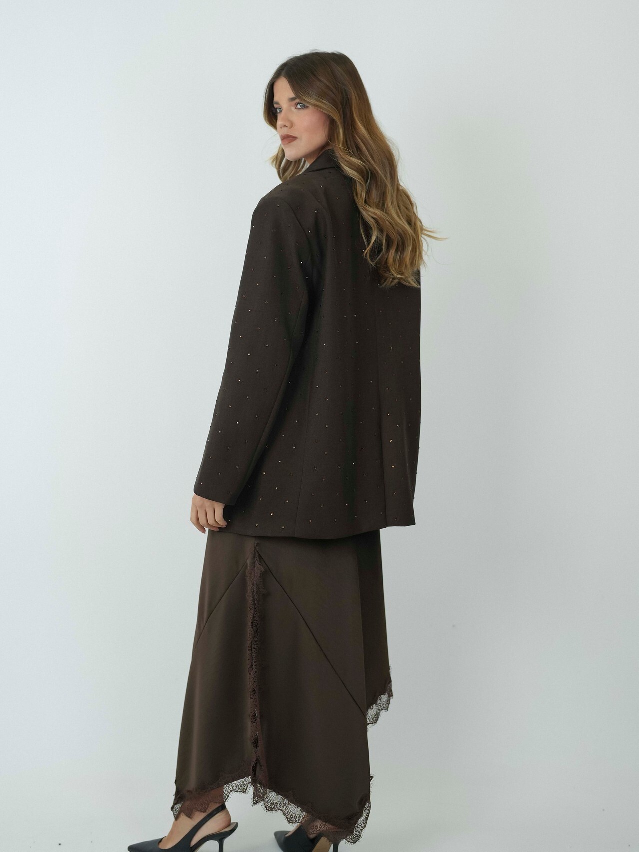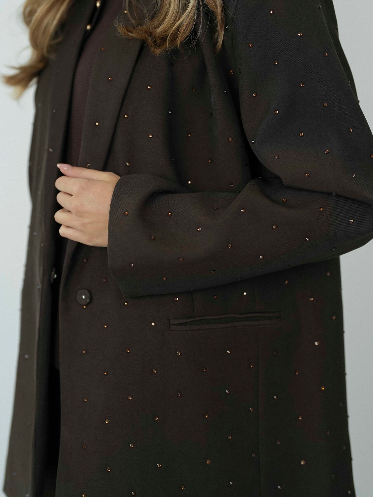 Eleve o seu look com este blazer sofisticado, adornado com brilhantes discretos que acrescentam um toque de glamour sem perder a elegância. O design moderno conta com bolsos invisíveis, garantindo um acabamento limpo e refinado, perfeito para quem aprecia detalhes de alta qualidade.