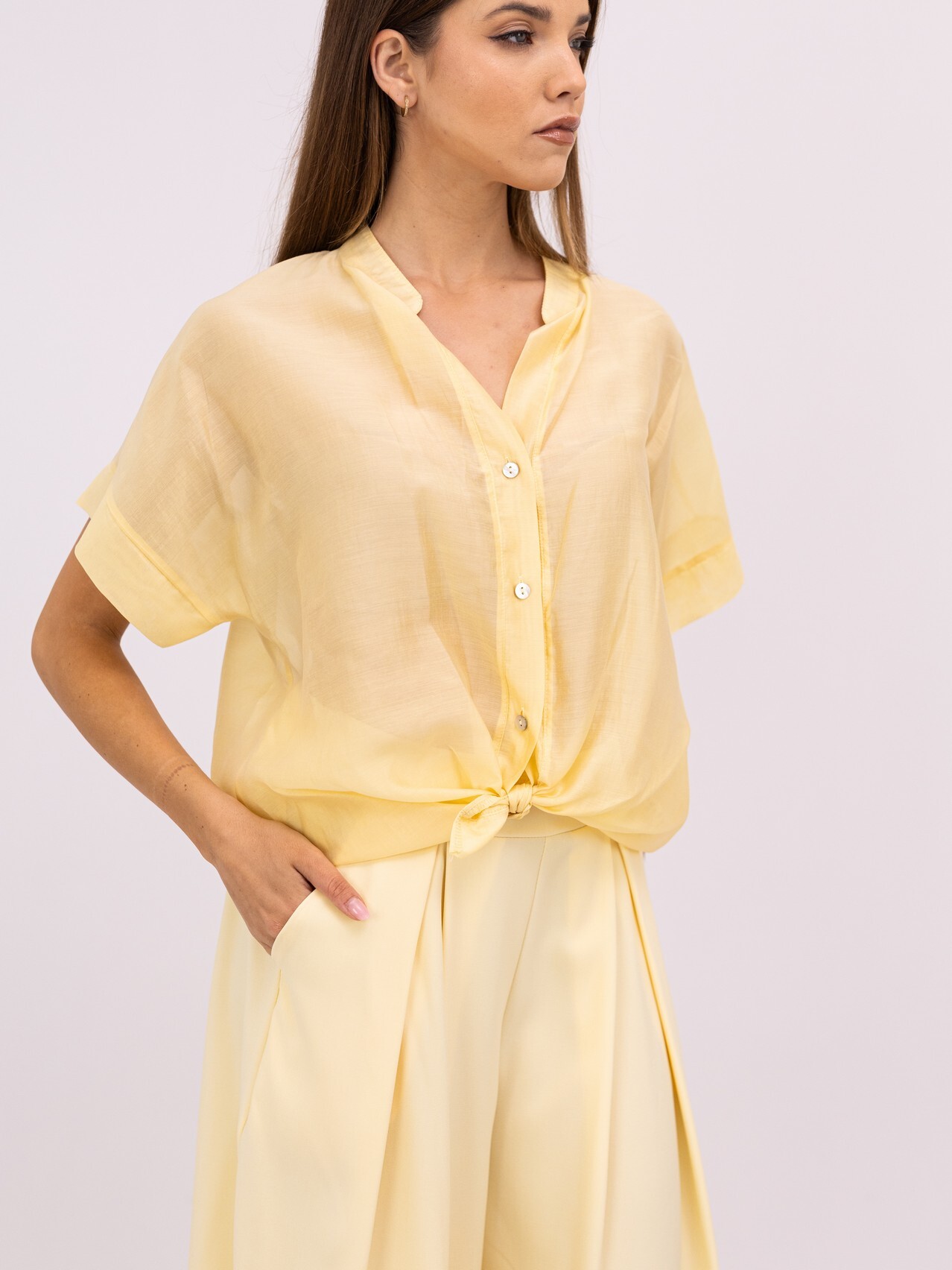 Esta blusa une a praticidade da manga curta ao charme do detalhe de nó na bainha. O corte solto garante total liberdade de movimentos e uma excelente respirabilidade. O tom amarelo pastel é uma tendência atemporal, fácil de combinar e ideal para transitar entre um look de trabalho casual e um encontro ao final do dia.