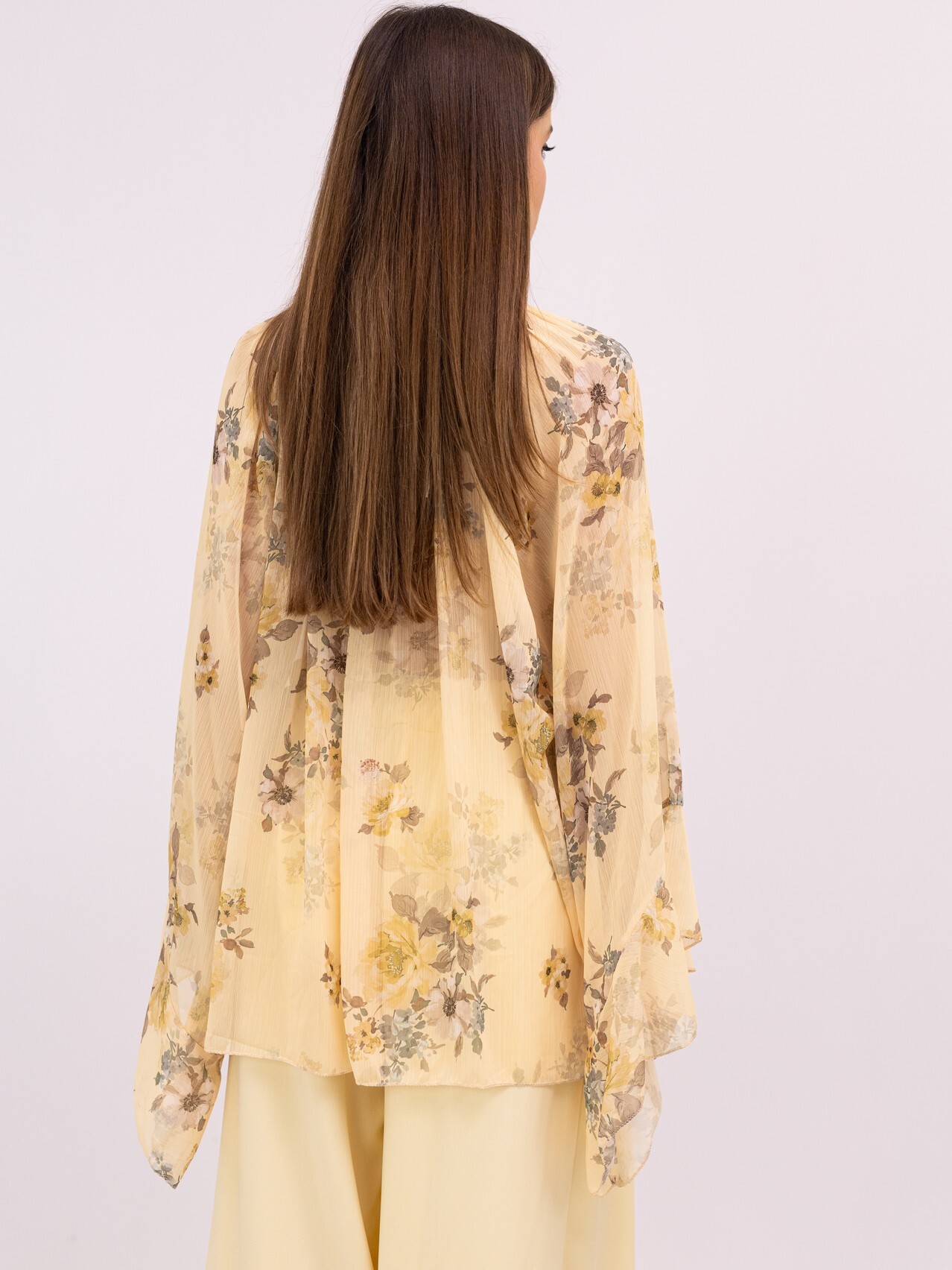 Design: Corte oversize fluido com tecido ligeiramente transparente (chiffon ou similar).