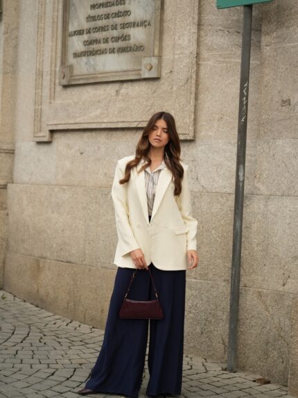 A calça perfeita para quem procura um equilíbrio entre o clássico e o contemporâneo. Com um caimento fluido e tecido de aspeto natural, esta peça adapta-se tanto a um ambiente formal com o blazer a conjunto, como a um look mais descontraído com uma t-shirt básica. A bainha larga permite o uso tanto com saltos altos como com sapatos rasos elegantes.