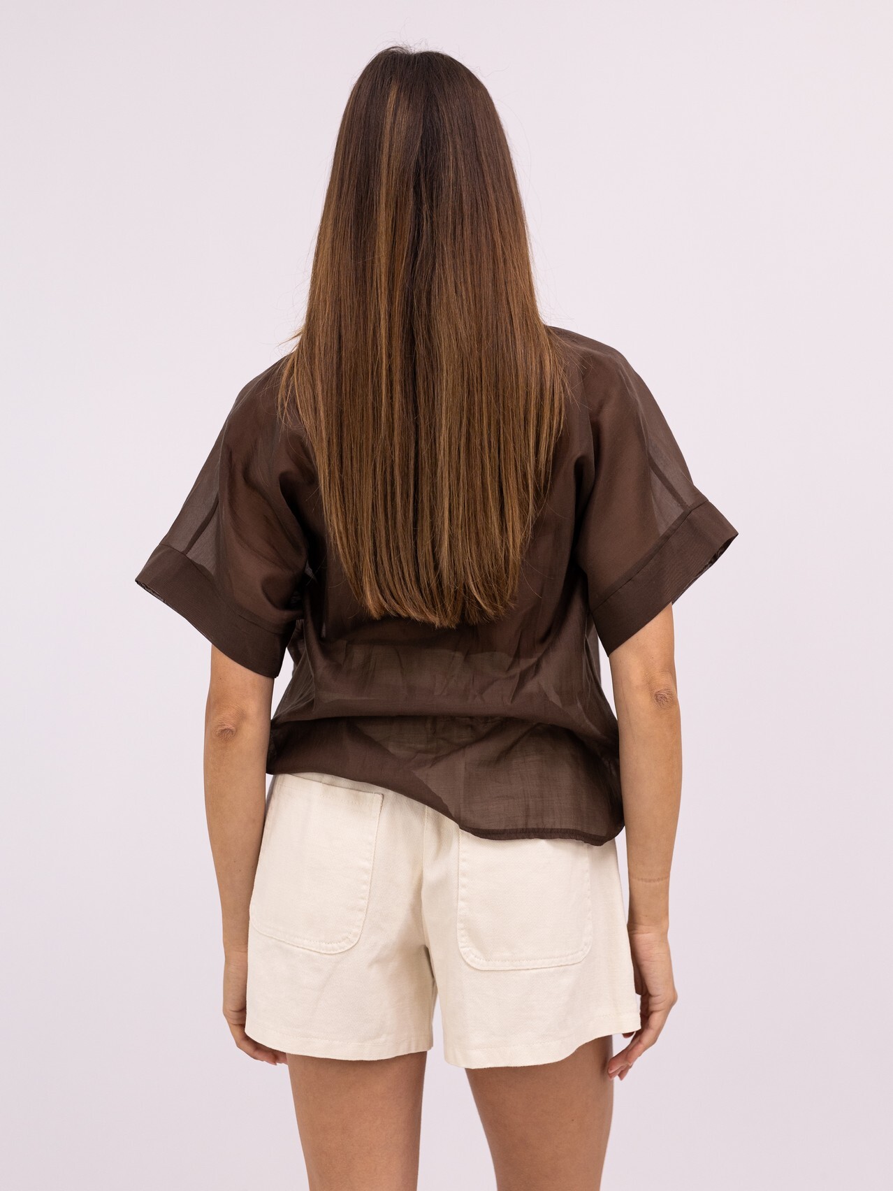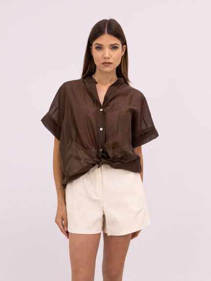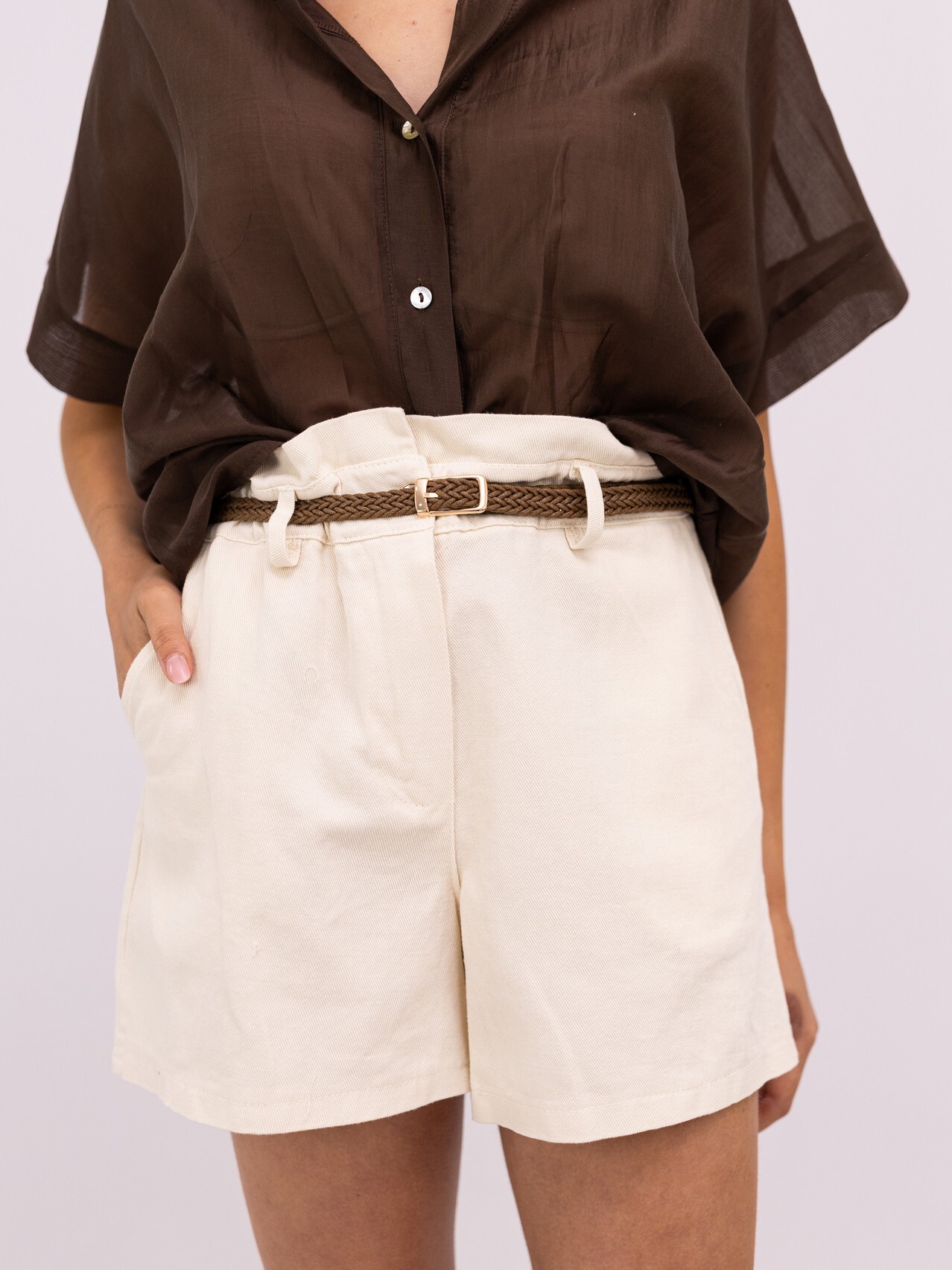 Combine funcionalidade e elegância com estes calções de cintura subida. O design estruturado, aliado à suavidade do tom cru, torna esta peça extremamente versátil, adaptando-se facilmente de um passeio na praia a um almoço na cidade. O detalhe do cinto fino em contraste define a silhueta de forma delicada.