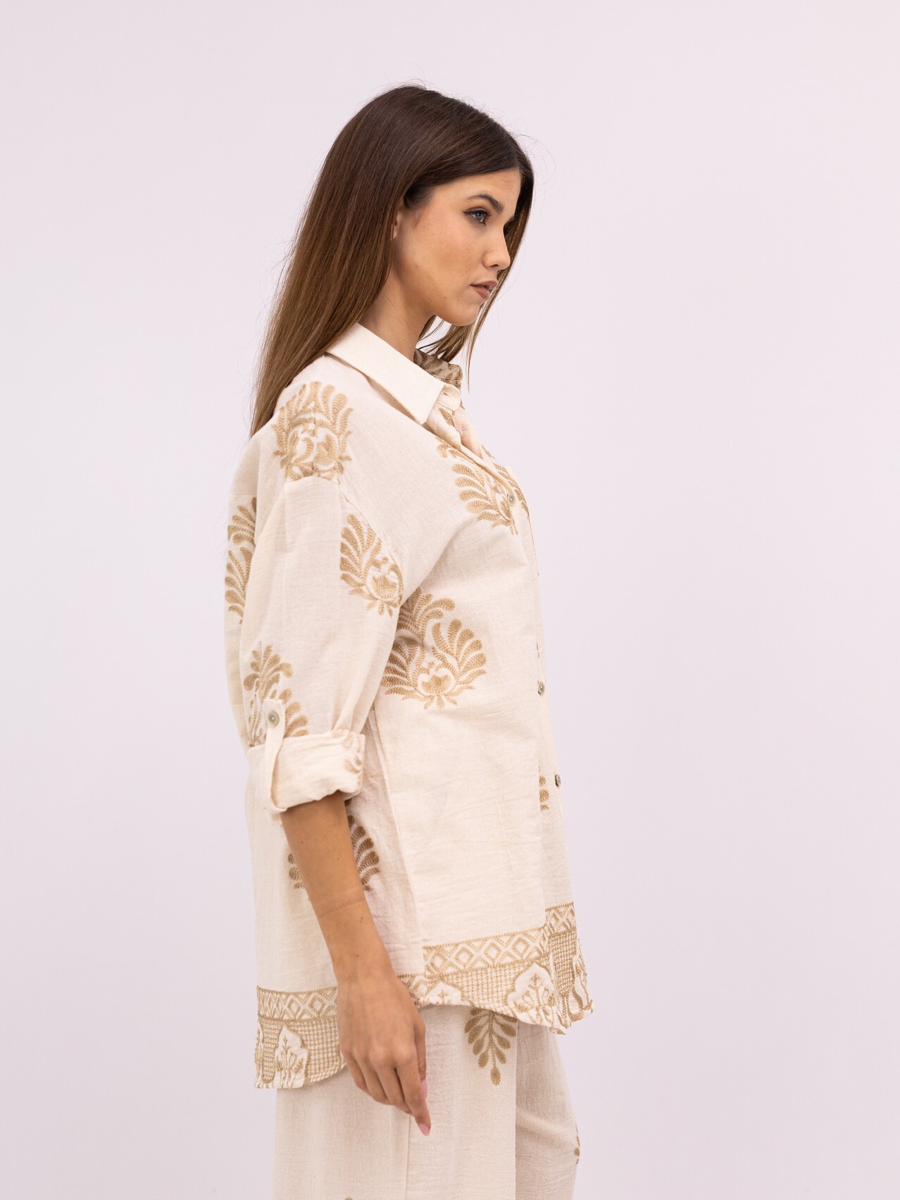 Apresentando bordados ornamentais em tons de dourado e bronze sobre uma base de tom cru, esta peça exala um luxo discreto e uma elegância natural.