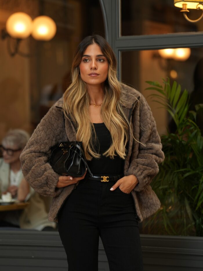 Casaco de pêlo curto, de toque macio e textura elegante, ideal para dias frios. Apresenta um fecho frontal discreto que garante um ajuste confortável e seguro. A gola alta inclui um atilho ajustável.