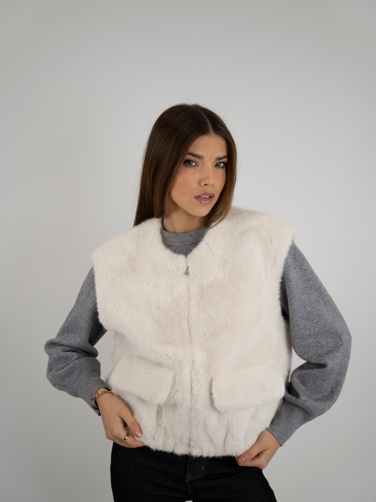 Colete de pelo macio e aconchegante, perfeito para acrescentar um toque de elegância e sofisticação ao look. Com design moderno e acabamento cuidadoso, é ideal para usar em sobreposições, garantindo conforto térmico e estilo em qualquer ocasião.