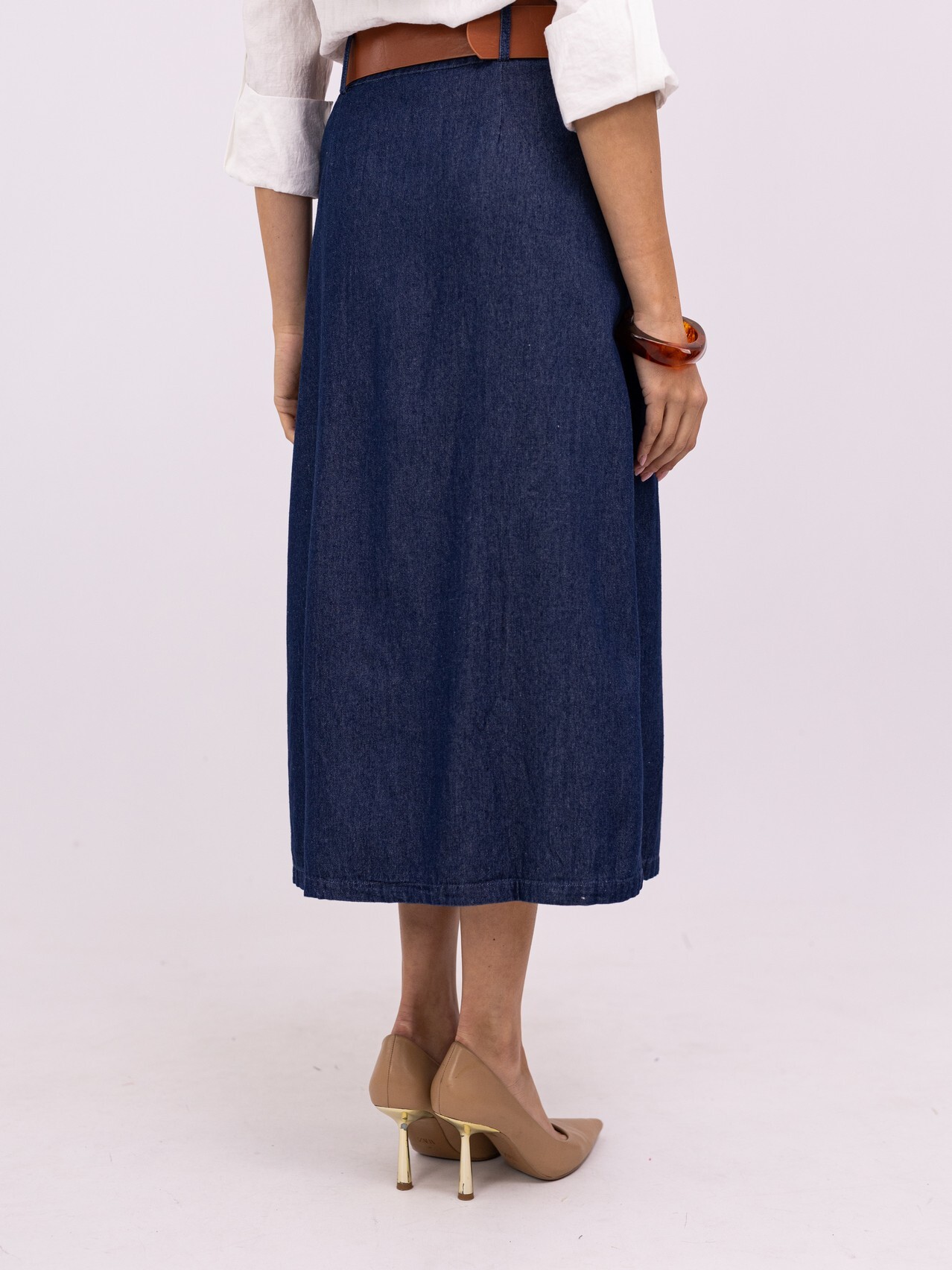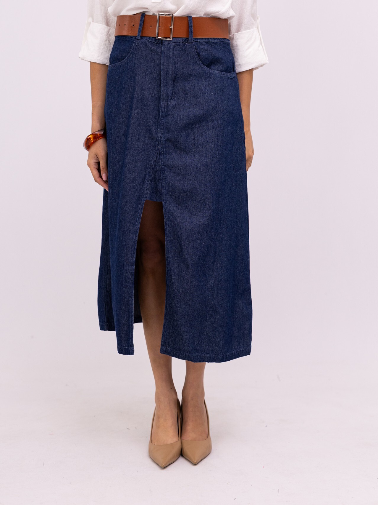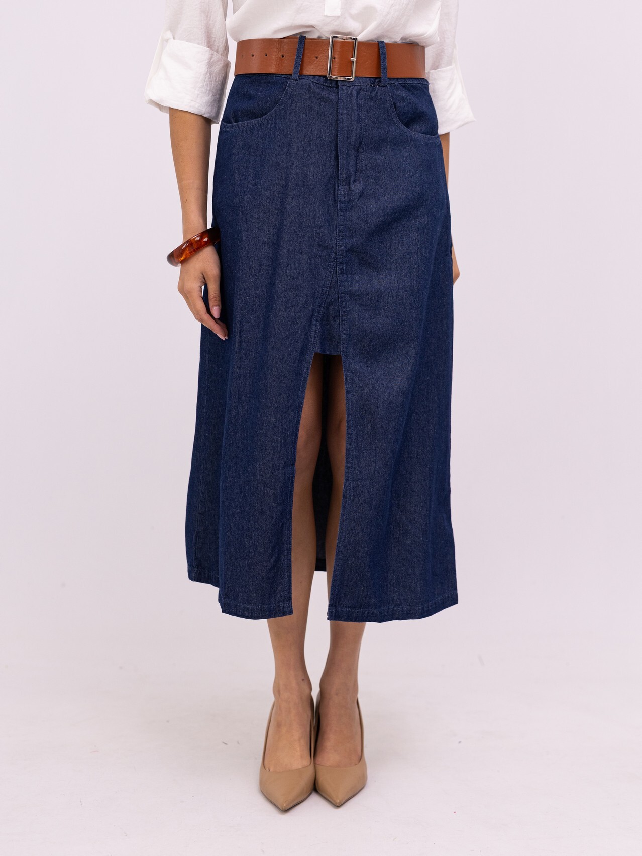 A harmonia perfeita entre o rústico e o refinado. Esta saia apresenta um corte de cintura alta com passantes largos, ideal para destacar a silhueta com o seu cinto favorito. O design inclui bolsos frontais funcionais e uma estrutura em ganga de alta qualidade que mantém a forma ao longo do dia. A abertura frontal não só adiciona estilo, como garante um caminhar fluido e confortável.