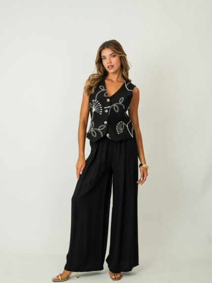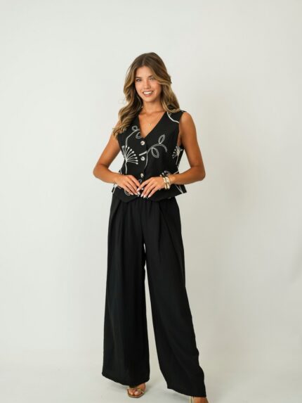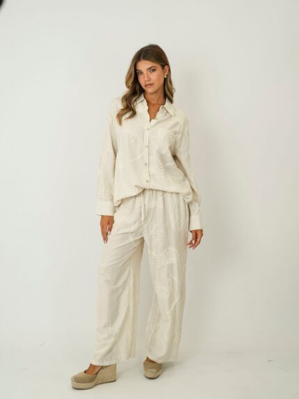 Tecido efeito linho. Design liso e leve. Manga longa com bordados decorativos. Corte reto e caimento confortável. Acabamento delicado nos detalhes. Versátil para combinações casuais e elegantes.